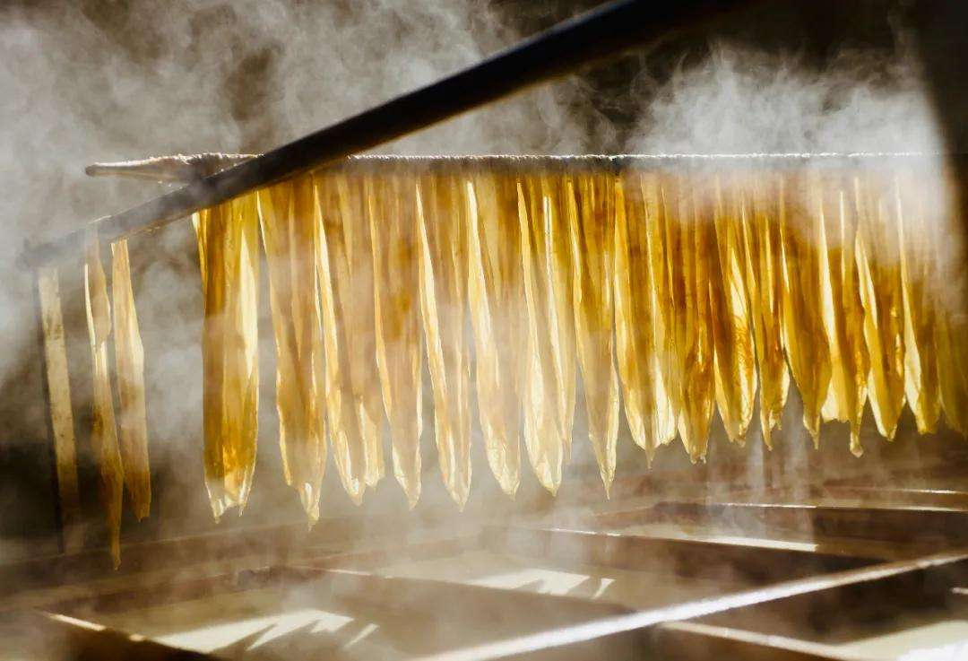 腐竹与“富足”谐音,有着安定富足之意。河源和平县腐竹制作历史可追溯至600多年前,和小豆腐竹甄选东北黄豆,历经选豆、浸泡清洗、磨浆、滤浆、煮浆、成型、干燥、包装等十余道工序制作而成,具有色泽金黄、豆香味浓、肉厚、久煮不糊、不碎、不浊汤等特点。